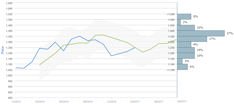 Traders who were asked regarding their longer-term views on gold between April 9 and May 9 expect, on average, to see the metal near 1,350 in early August. Generally, 47% (+2%) of participants believe the price will be above 1,350 in ninety days. Alongside, 35% (+2%) of those surveyed reckon the metal will trade in the range between 1,200 and 1,350 over the next three months.