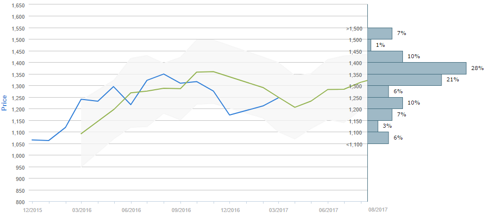 Traders who were asked regarding their longer-term views on gold between April 12 and May 12 expect, on average, to see the metal near 1,350 in early August. Generally, 46% of participants believe the price will be above 1,350 in ninety days. Alongside, 37% (+1%) of those surveyed reckon the metal will trade in the range between 1,200 and 1,350 over the next three months.