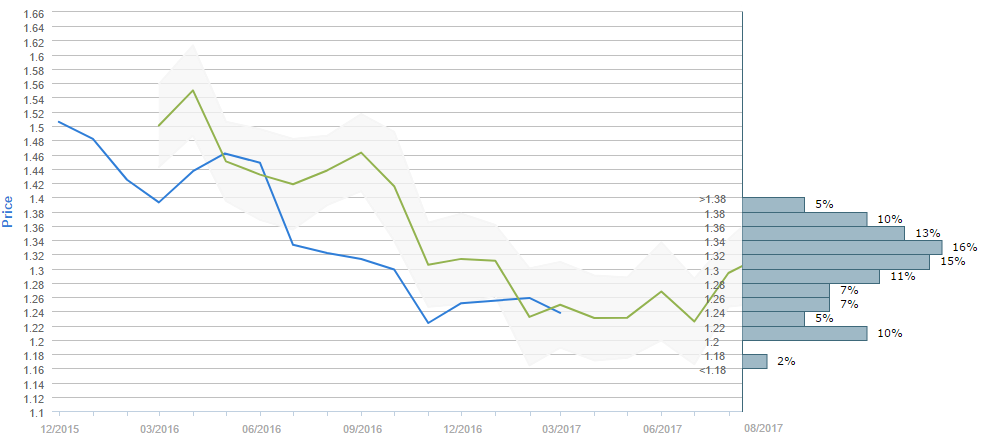 By the end of the next three months traders believe the Cable is to rise above the 1.30 major level, as 59% of survey participants believe so. While the current price is around 1.29, the average forecast for August 12 is 1.3034. The 1.32-1.34 range is now the most popular price interval, having 16% of the votes, while second comes the 1.30-1.32 interval with 15% of the voters, and the third place is tied by the 1.34-1.36, with 13% of poll participants choosing this option.