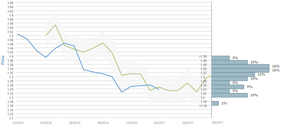 By the end of the next three months traders believe the Cable is to rise above the 1.30 major level, as 59% of survey participants believe so. While the current price is around 1.29, the average forecast for August 16 is 1.3034. The 1.32-1.34 and the 1.34-1.36 ranges are now the most popular price intervals, having 16% of the votes each, while second comes the 1.30-1.32 interval with 12% of the voters, and the third place is tied by the 1.20-1.22, the 1.28-1.30 and the 1.36-1.38, with 10% of poll participants choosing either of these options.