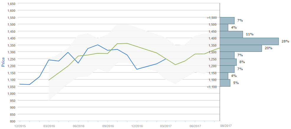 Traders who were asked regarding their longer-term views on gold between April 16 and May 16 expect, on average, to see the metal near 1,350 in August. Generally, 50% of participants believe the price will be above 1,350 in ninety days. Alongside, 35% (+1%) of those surveyed reckon the metal will trade in the range between 1,200 and 1,350 over the next three months.