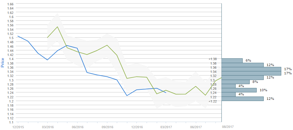 By the end of the next three months traders believe the Cable is to rise above the 1.30 major level, as 64% of survey participants believe so. While the current price is around 1.29, the average forecast for August 18 is 1.3085. The 1.32-1.34 and 1.34-1.36 ranges are now the most popular price intervals, having 17% of the votes.