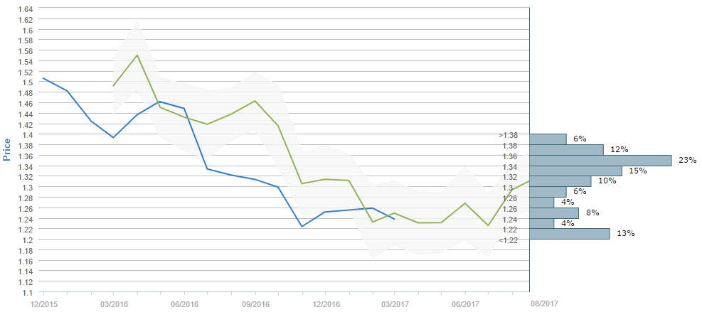 By the end of the next three months traders believe the Cable is to rise above the 1.30 major level, as 66% of survey participants share this belief. While the current price is around 1.30, the average forecast for August 22 is 1.31. The 1.34-1.36 range is now the most popular price interval, having 23% of the votes.
