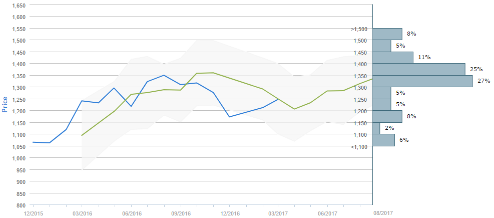 Traders who were asked regarding their longer-term views on gold between April 23 and May 23 expect, on average, to see the metal just below 1,350 in late August. Generally, 50% of participants believe the price will be above 1,350 in ninety days. Alongside, 37% (+3%) of those surveyed reckon the metal will trade in the range between 1,200 and 1,350 over the next three months.