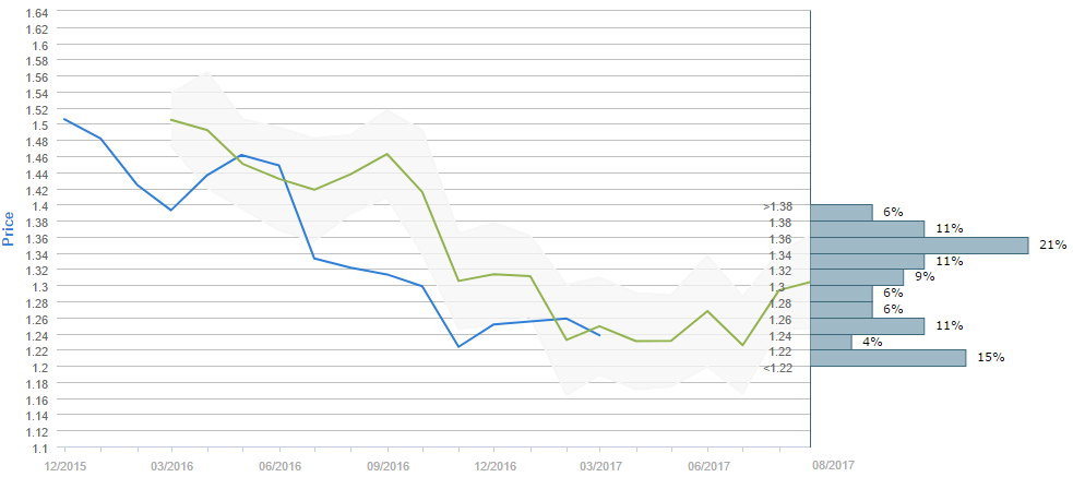 By the end of the next three months traders believe the Cable is to rise above the 1.30 major level, as 58% of survey participants share this belief. While the current price is around 1.30, the average forecast for August 26 is 1.3036. The 1.34-1.36 range is now the most popular price interval, having 21% of the votes, while on the second place are the 1.20-1.22 interval, with 15% of the voters choosing it.
