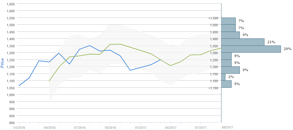 Traders who were asked regarding their longer-term views on gold between April 31 and May 31 expect, on average, to see the metal just below 1,350 by September. Generally, 44% (-1%) of participants believe the price will be above 1,350 in ninety days. Meanwhile, 34% of those surveyed reckon the metal will trade in the range between 1,250 and 1,350 over the next three months.