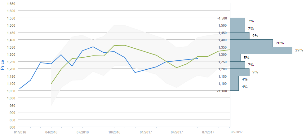 Traders who were asked regarding their longer-term views on gold between May 2 and June 2 expect, on average, to see the metal just below 1,350 in September. Generally, 43% (-1%) of participants believe the price will be above 1,350 in ninety days. Meanwhile, 34% of those surveyed reckon the metal will trade in the range between 1,250 and 1,350 over the next three months.