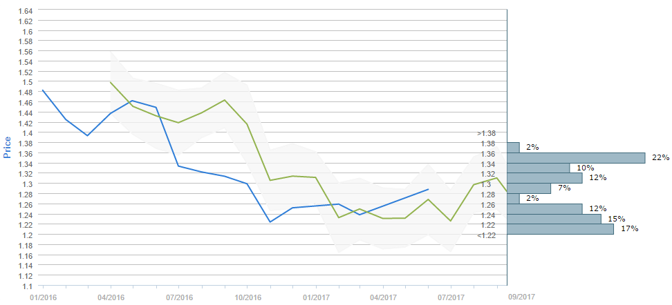 Traders believe the Cable is to rise above the 1.30 major level by the end of the next three months, as 53% of survey participants share this belief. While the current price is around 1.27, the average forecast for September 13 is 1.2837. The 1.34-1.36 range is still the most popular price interval, having 22% of the votes, while on the second place is the 1.20-1.22 interval, with 17% of the voters choosing it.