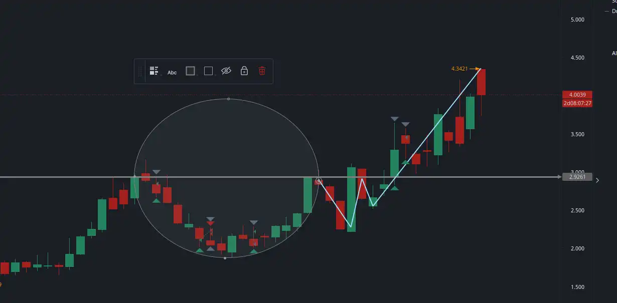 The price of GAS.CMD decreased from $2.9261 to $2.000, forming a rounded bottom. It then recovered to $2.9261 over the following weeks and consolidated slightly around $2.350, forming the handle. Once the price broke above $2.9261, the Cup and Handle pattern was complete. Adding the depth of the cup ($0.9261) to the breakout level gives a target price of $3.8522, signalling a strong bullish trend.