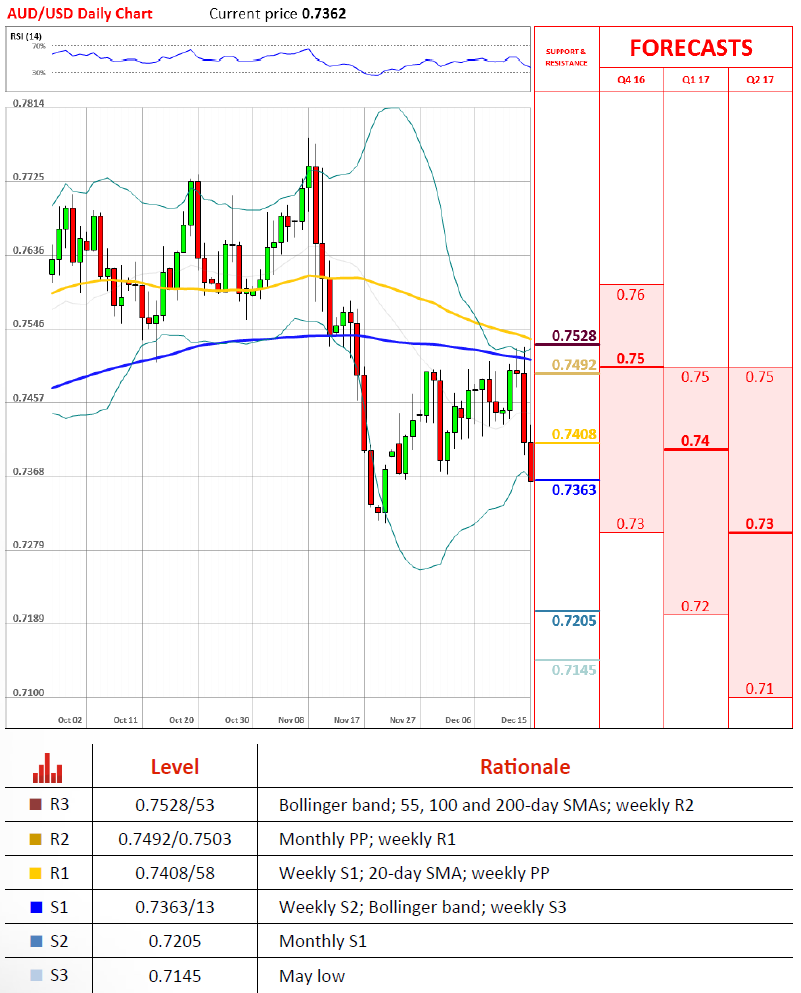 On Wednesday the AUD/USD currency pair slumped slightly less than 100 pips, with the 0.74 major level managing to limit the losses. The Aussie remains under pressure, with the 0.74 major level no longer providing sufficient support. As a result, the commodity currency risks falling towards 0.7340, the area where the weekly S2, the weekly S3 and the lower Bollinger band form relatively strong demand. Even though technical indicators in the daily timeframe retain mixed signals, the longer period ones remain bearish.
