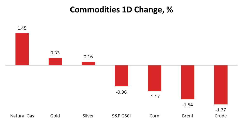 Investors estimate another surge in US oil stockpiles for the week ended October 23. This projection was pushing oil prices lower yesterday when they declined by more than 1.5%. Corn prices fell by 1.2% and helped the benchmark S&P GSCI Index to register an almost one percentage point slump during the observed trading session. Meanwhile, weather experts suggest the upcoming winter will be unusually warm in the United States, which usually decreases demand for natural gas. Even though prices for US consumers reached their lowest level since 2012, the market-traded price of natural gas managed to recover by 1.5% on Tuesday. Precious metals resumed growing amid the ultra-low expectation the Fed will raise interest rates today. Gold and silver were up by 0.3% and 0.2%, accordingly.