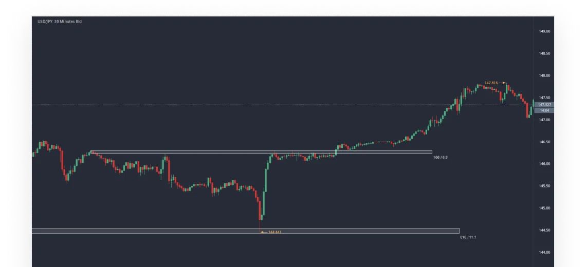 A day trader observes that the USD/JPY currency pair is set to experience strong volatility due to the release of the US monthly employment data at 12:30 GMT. They analyze short-term technical indicators and spot a support zone near 144.50 being approached following the event. The trader decides to enter a long position at 144.50, anticipating a price increase. As the price reaches a prior high level zone at 146.20 later in the day, the trader exits the position, pocketing a quick profit of 70 pips within a few hours.