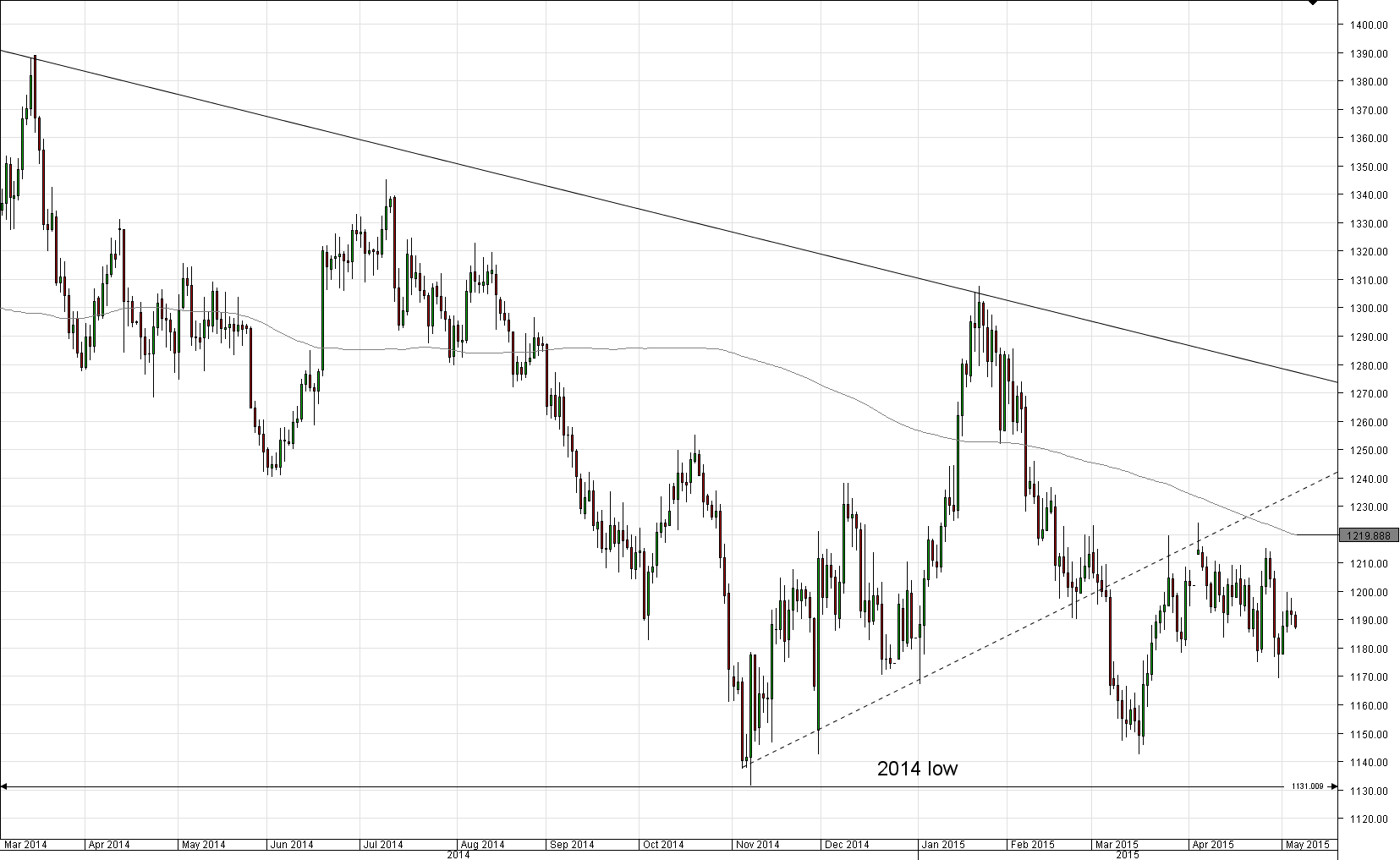 Since the second quarter of 2013, the bullion has been developing inside the falling wedge pattern, meaning that trading range is decreasing as time goes on. In March 2014, however, the yellow metal resumed gaining value, even without touching the lower trend-line, at that time located around 1,150. Towards the end of June gains are likely to be limited and the bullion should be driven by the 200-day SMA around 1,220 with a slight bearish bias. Eventually, bears are forecasted to overtake a lead and drive the metal back to the south. The overall negative trend for Gold seems to be the case in the long-term future, while at the end of this year the precious metal is likely to consolidate around 1,150, if the present trend persists.Daily chart