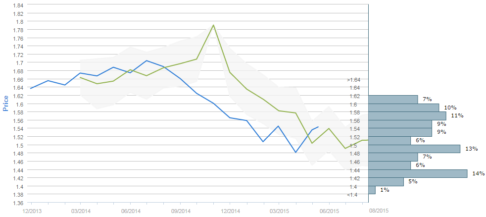 The mean forecast for August 11 is 1.5106, while the majority (52%) of survey participants expect the Sterling to cost more than 1.50 dollars in three months. The most popular price intervals is 1.42-1.44, chosen by 14% of the surveyed. The second most popular choice is taken by the 1.48-1.50 price interval, selected by 13% of the voters.