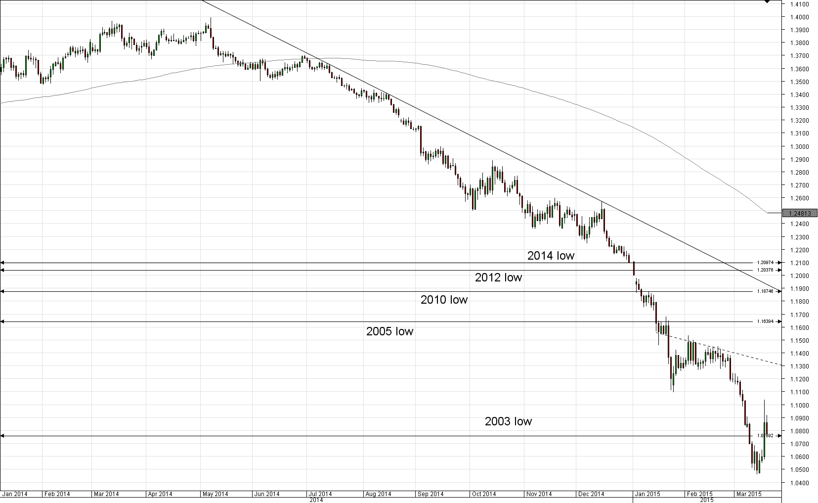 The long-term outlook for the EUR/USD currency pair is remaining bearish. On January 22, the ECB has made a long-awaited decision to expand its asset purchases by buying government bonds since March 9. The programme is likely to continue pushing the Euro downwards. Moreover, the lowest point in more than 12 years below 1.07 has already been hit by EUR/USD cross. Taking into account present monetary conditions and bearish outlook for the Euro, the pair has a chance to reach parity towards the end of June. Short-term bullish actions may take place, but their impact and size are still expected to be inappropriate for the common currency to commence a stable recovery in the medium-term. Moreover, some market participants suggest it may fall further and even trade below the parity in course of second half the year.Daily chart