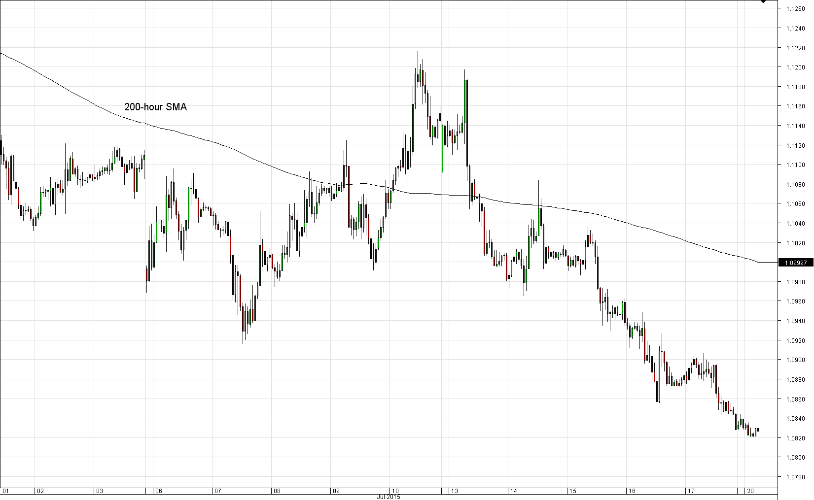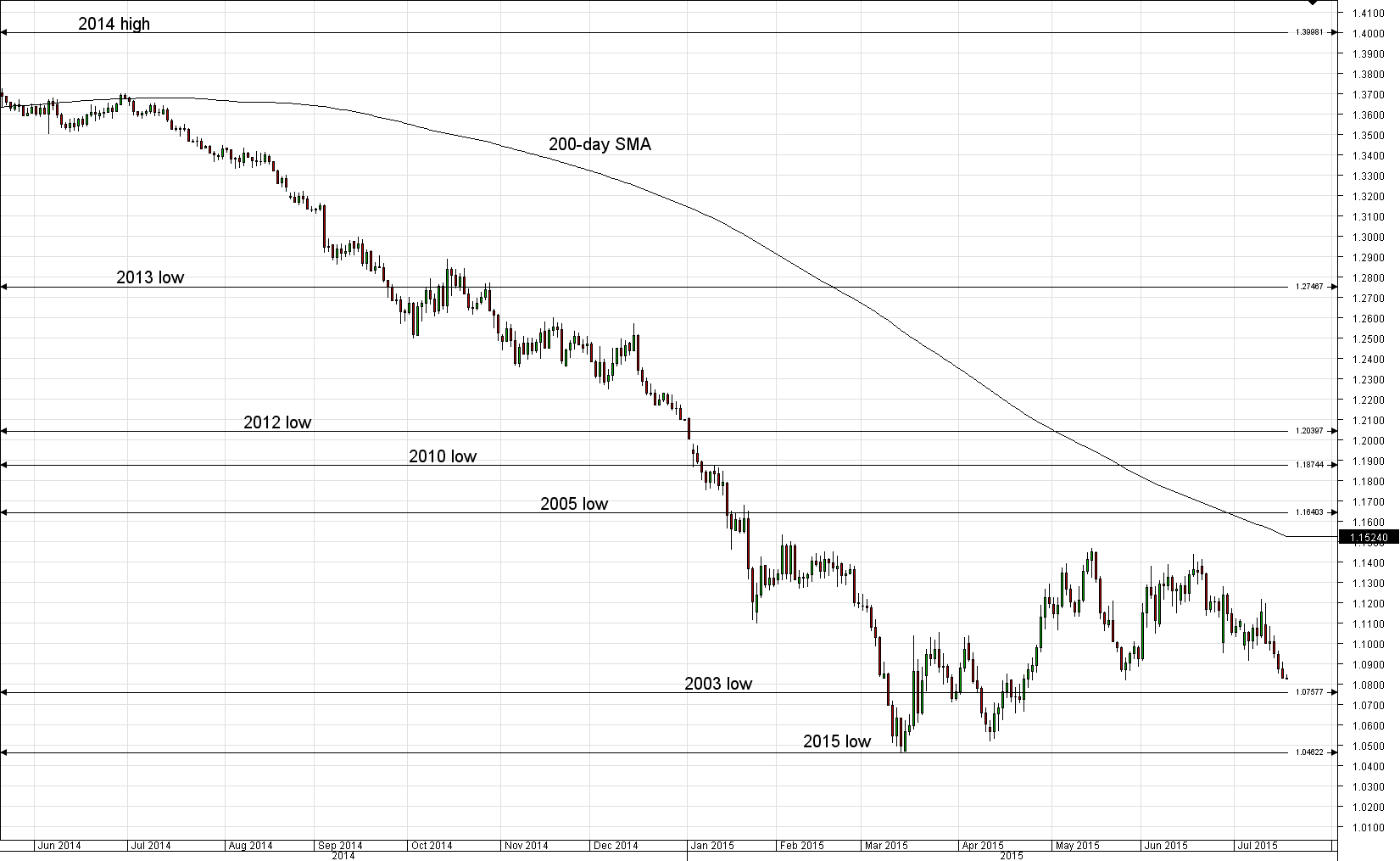 Judging from EUR/USD's developments that took place since May of the previous year, the pair is clearly trading downwards on a long-term chart. At the same time, it seems that now the pair is being bounded between the 2014 low and long-term downtrend line, meaning that it is currently hovering inside the descending triangle pattern. Moreover, this pattern implies a narrowing trading range, while the break-out point can be reached by the end of September. In the medium-term the common European currency may show spikes as high as 200-day SMA and 2005 low at 1.16, but the downtrend will remain the main resistance and should be capable of pushing the cross back in the direction of 1.05-1.10 area in the long run.Daily chart