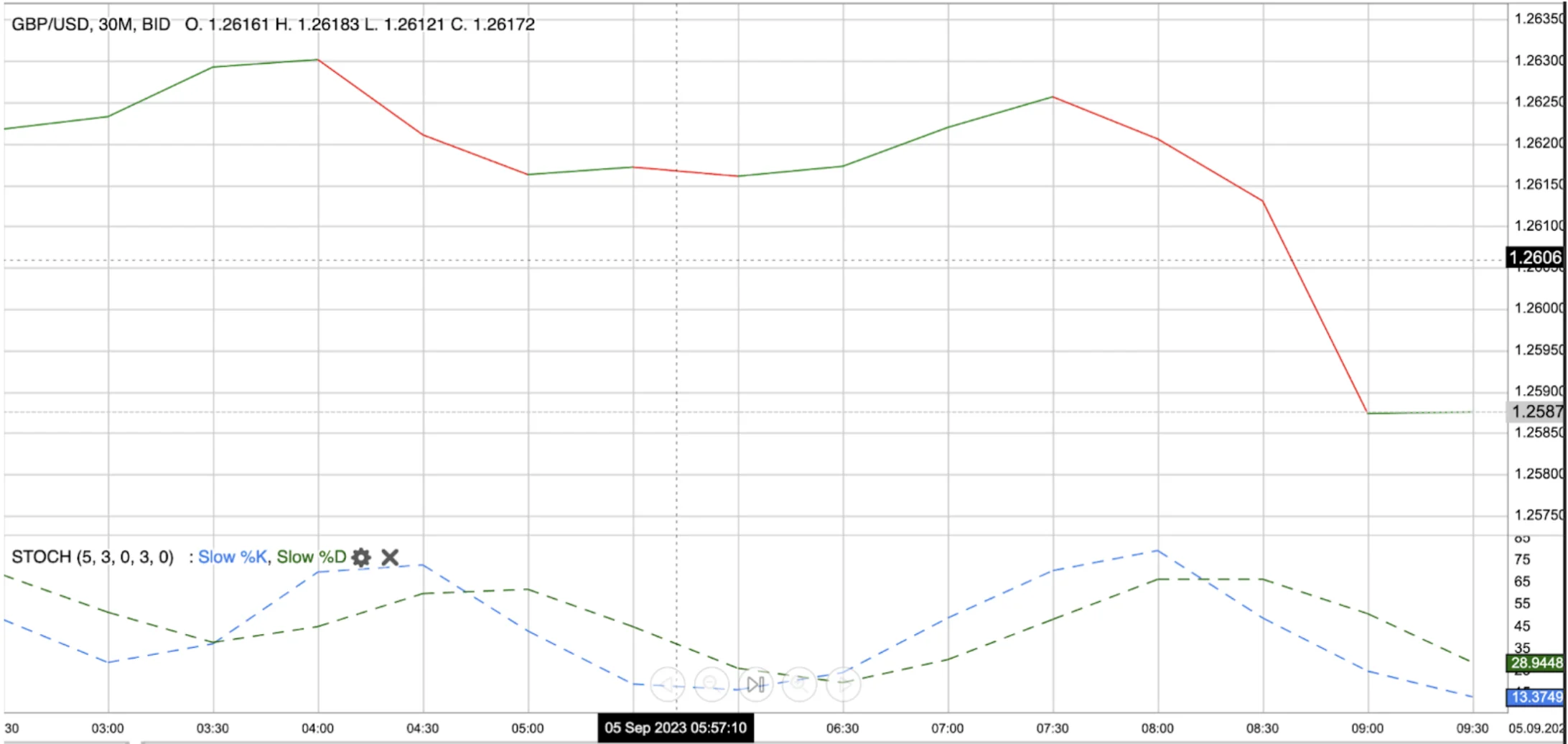 Scenario: You're analyzing the GBP/JPY currency pair in a 30-minute timeframe, and the %K line of the Stochastic Oscillator crosses above the %D line, both of which are in the oversold region (below 20).