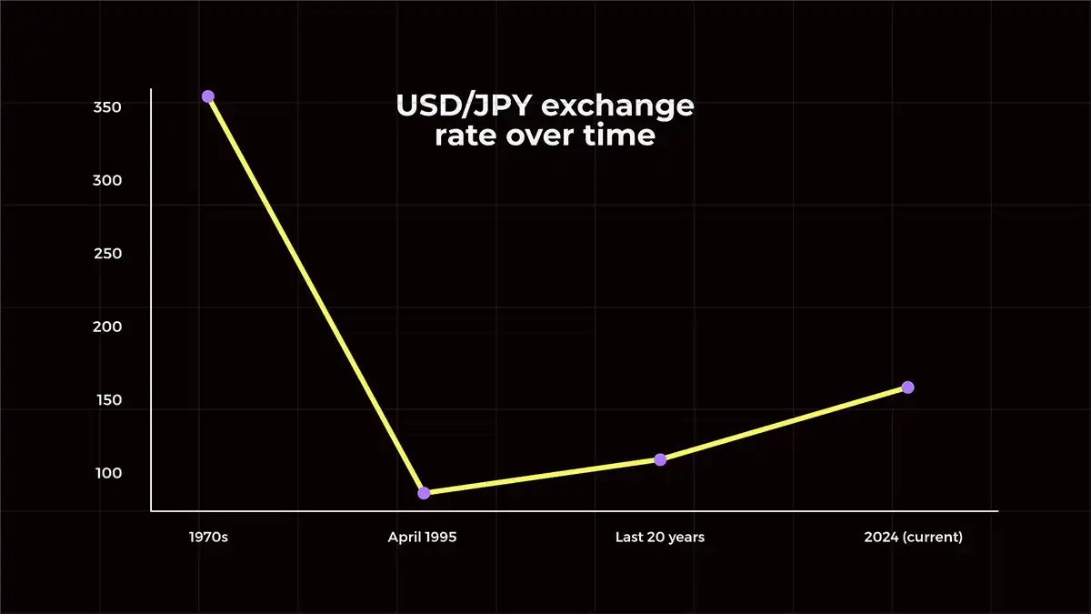 • The yen experienced a notable increase in value during the 1980s and 1990s, peaking at a record 79.75 yen per dollar in April 1995.