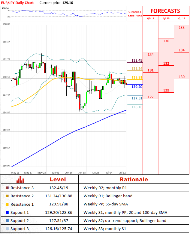 "Евро стремительно вырос. Но на данный момент экономика европы ослаблена, поскольку показатель инфляции достаточно низок, а цнетральный банк склонен к ведению мягкой политики"- Commonwealth Bank of Australia (по материалам Bloomberg) Перспективы парыEUR/JPY движется в пределах горизонтального канала, состоящего из скользящего среднего за 55 дней на отметке 129.88 сверху и месячного пивот уровня на отметке 128.57 снизу. Нижняя граница корридора так же укреплена скользящим за 100 дней и восходящей линией поддержки, что должно обеспечить сохранность бычьему прогнозу по данной валютной паре. Настроение трейдеровНастроение участников рынка SWFX относительно данной валютной пары не изменилось. Как и прежде, преимущество быков составляет 10%. Разница между количеством ордеров на покупку (51%) и продажу (49%) снизилась до 1%.
