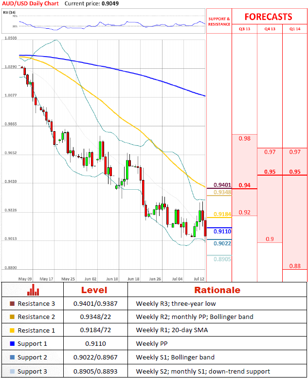 "Детали заседания ФРС показали, что сторонники прекращения количественного смягчения все еще численно превосходят противников этого решения"- Haitong International Research (по материалам MarketWatch)Перспективы парыВчера AUD/USD упал ниже отметки 0.9184/72, но сегодня пара уже движется под недельным пивот уровнем вблизи области 0.9022/0.8967, где на данный момент находится нижняя часть полосы Боллинджера и недельная S1. Однако, нисходящее движение все еще имеет возможность продолжиться и достигнуть нисходящей линии поддержки на отметке 0.8905/0.8893, после чего, вероятно, пара сможет достигнуть уровня 0.8568.