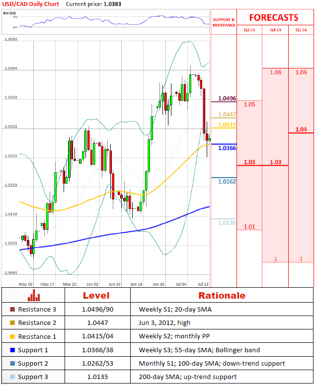 Перспективы парыНа данный момент USD/CAD проходит через фазу консолидации, что было вполне ожидаемо после вчерашнего движения данной валютной пары. Ближайший уровень сопротивления и поддержки находятся на отметках 1.0415/04 и 1.0365/38, соответственно, однако мы не ожидаем, что они смогут долго выдерживать давление пары. Технические индикаторы указывают на повышенную вероятность начала восходящего движения, однако для этого паре необходимо закрыться над уровнем 1.0447, поскольку это восстнаовит бычий прогноз.
