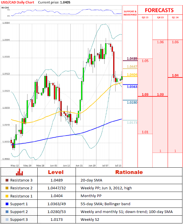 "Ожидается, что банк Канады продолжит вести мягкую монетарную политику"- Scotiabank (по материалам Reuters)Перспективы парыВалютная пара сегодня уже достигла первичного уровня сопротивления на отметке 1.0447/32, однако, движение USD/CAD все еще ограничено месячным пивот уровнем на отметке 1.0404, в то время как уровень 1.0362/49, состоящий из скользящего среднего за 55 дней и нижней части полосы Боллинджера, продолжает оказывать паре поддержку. Судя по показаниям технических индикаторов, даже в случае падения USD/CAD сквозь вышеупомянутую поддержку, пара столкнется с главным уровнем на отметке 1.0280/53, после чего начнет восстановление. Прогноз положителен на всех временных отрезках.