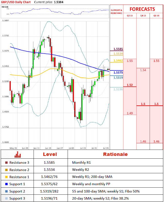 Перспективы пары Прошлая неделя была достаточно волатильной для пары и мы можем ожидать похожие обстоятельства и на этой неделе. Так как краткосрочные RSI и Стохастический индикаторы предполагают, перед парой стоит значительный риск к понижению. Львиная доля этого риска может исчезнуть, если паре удастся закрепиться над 200-дневным скользящим средним. Понижения остановит поддержка в районе 1.531/28.