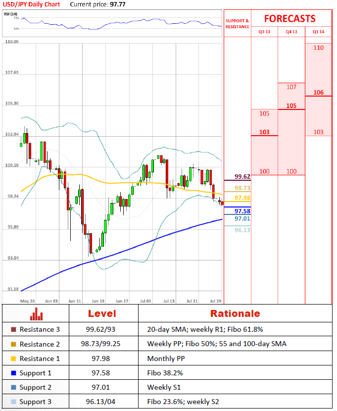 Перспективы пары Несмотря на явное бычье настроение на рынке, развитие пары в первые дни этой недели сигналит о весомой слабости. Вероятно, что некая тенденция к понижению устоит, невзирая на тот факт, что краткосрочные технические индикаторы сменили совокупный сигнал с негативного на нейтральный. Пара должна обрести поддержку и стабилизироваться на уровне 97 JPY. Временные ралли должны ограничиваться областью 98.7/99.2.