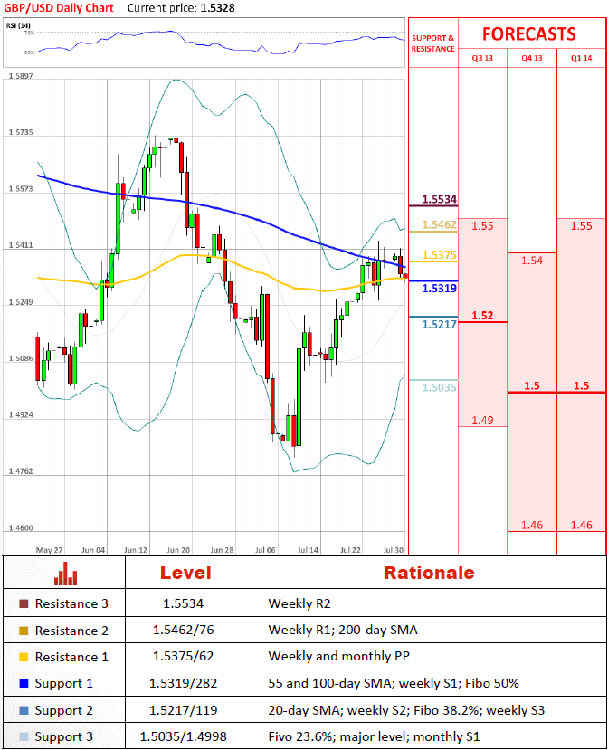 Перспективы парыНедельная и месячная РР не смогли предоставить достаточную поддержку для пары, которая понизилась на 80 пунктов. На данный момент её поддерживает скопление уровней (55 и 100-дневные скользящие средние, недельная S1 и линия Фибоначчи 50% (движение с июня по начало июля)), который, вероятно, поддержит её некоторое время. Однако, среднесрочные и долгосрочные перспективы пары остаются медвежьими. Пара может продемонстрировать временные ралли, но они не должны продвинуться выше 1.546.