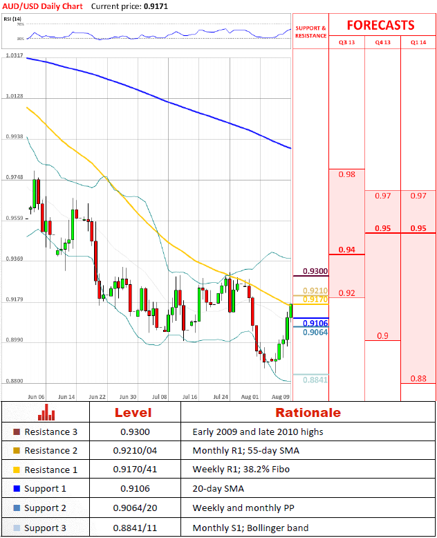 Перспективы парыЦелую неделю пара AUD/USD была на подъеме, проходя каждое сопротивление, которое встречалось на ее пути, не обращая внимания на то, что технические индикаторы остаются смешанными на дневном и месячном графиках, а на недельном графике они дают даже, в большей степени, сигнал на продажу. Следующей жертвой валютной пары является сопротивление на 0.9170/41, эта область охраняет 0.9210/04, но не ожидается, что восхождение превзойдет максимумы начала 2009 года и конца 2010 года на уровне 0.93.