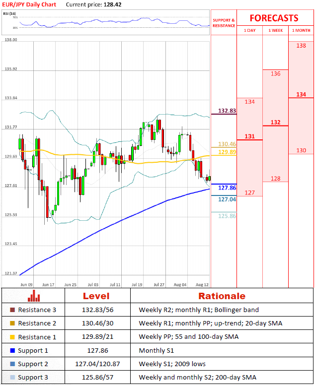 Last week a rebound from the monthly S1 was capped by the resistance at 129.89/21 that consists of the 55 and 100-day SMAs. Today the currency pair appears to be willing to bounce off the monthly support at 127.86 once again and will then face the same obstacle it did recently. We do not expect this time to be different from the last one, the near-term perspectives are bearish.