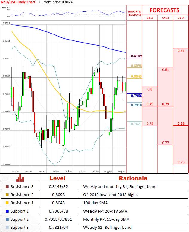 NZD/USD did not manage to extend its dip, rebounding from the support created by the monthly and weekly PP. Accordingly, the pair is now likely to come back to the 100-day SMA that safeguards Jun 2013 highs. Slightly higher there is an even stronger resistance zone at 0.82, it proved to be important in 2008 and in the first quarter of 2013, not to mention the 200-day SMA that stands there as well.