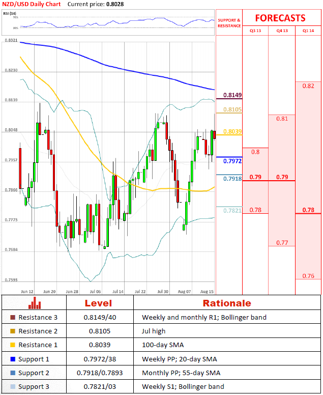 Despite the density of the area from 0.80 up to 0.82, which is littered with various resistances, NZD/USD manages to spike upwards from time to time. Today the currency pair fetched a Jul high at 0.8105. Nevertheless, the bearish scenario is still favoured over any other course of events in the medium term. The major trend-line at 0.7731 is likely to be re-tested.