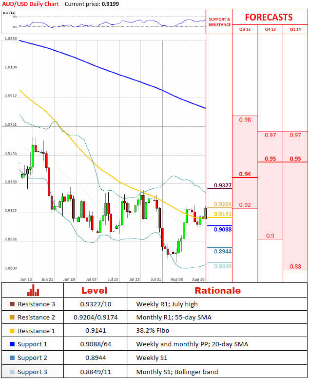 Even though the risks are largely skewed to the downside, today the currency pair is showing willingness to penetrate the resistance at 0.9204/0.9174, the last defence before the price reaches the July high. The latter level is not expected to be violated in the medium term, it should cap AUD/USD at 0.9317 and subsequently send the pair towards the support at 0.9088/64.
