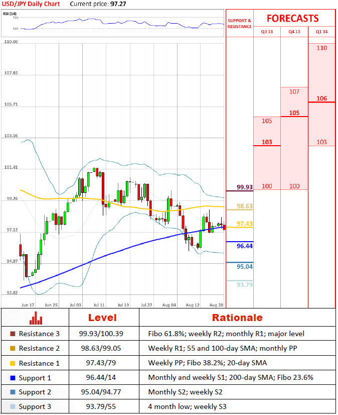 Перспективы парыКажется, что вчера пара получила незначительный медвежий импульс от 20-дневного скользящего среднего, так как её ралли выше уровня 98 JPY долго не продлилось и пара понизилась почти на 100 пунктов. Кроме того, краткосрочные и среднесрочные технические индикаторы способствуют медвежьим настроениям, отмечая дальнейшее понижение пары. На данный момент пара пройдет, вероятнее всего, до 95 JPY в среднесрочной перспективе и до 94 JPY в долгосрочной.