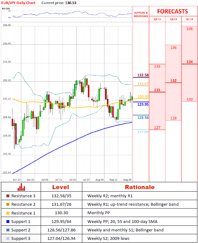Перспективы парыЭто уже седьмой по счету день, когда пара EUR/JPY пытается подпрыгнуть выше месячной точки разворота на 130.30, и в конце концов ей удастся это сделать, так как месячные технические показатели говорят в пользу такого развития событий. Как только этот рубеж будет пройден, тогда бычья линия тренда на 131.67/26 будет противостоять развитию восхождения и, скорее всего, уменьшит темпы удорожания евро.