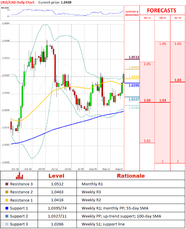 Перспективы парыНа данный момент кажется, что эта неделя является полностью бычьей для USD/CAD, так как валютная пара сейчас находится в 100 пунктах над ценой открытия этой недели. Сейчас пара проходит сопротивление на 1.0416, но ни этот уровень, ни следующий на 1.0463, вряд ли, будут содержать в себе рост на протяжении долгого времени. Месячная R1 на 1.0512, с другой стороны, представляет собой реальную угрозу для восходящего тренда.