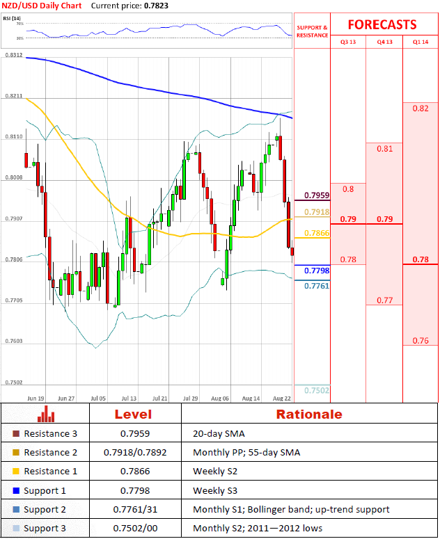 Перспективы парыСнижение пары NZD/USD длиной в три дня, похоже, подошло к концу, так как цена почти не изменилась с сегодняшнего открытия на 0.7842, и осталась всего лишь немного выше последней недельной поддержки на 0.7798. В течение последних трех дней, с другой стороны, валютная пара понизилась более, чем на 270 пунктов и мы до сих пор видим потенциал для расширения этого падения.