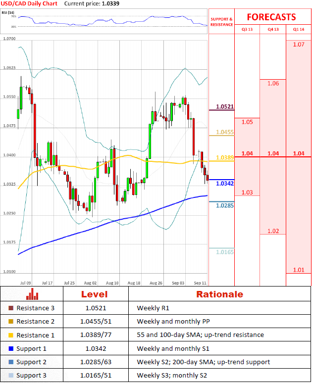 Перспективы парыUSD/CAD, в большинстве своем, игнорирует близлежащие уровни поддержки, поэтому оставаясь в понижающем тренде. 55 и 100-дневные средние скользящие, включая восходящую линию тренда, уже находятся позади, и сейчас настала очередь быть нарушенными недельному и месячному уровням S1. Тем не менее, падение, скорее всего, будет ограничено областью 1.0285/63, так как она состоит из 200-дневной средней скользящей и главной бычьей линии тренда.