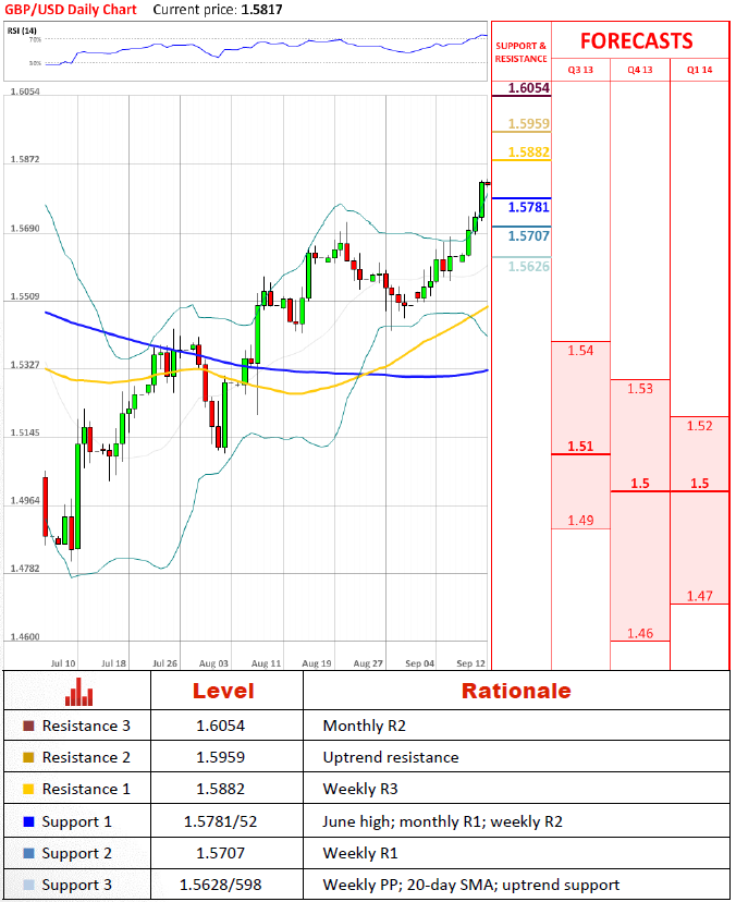 Перспективы парыМы не можем сказать, что это происходило без трудностей, но пара поднялась над июньским максимумом. Пара продемонстрировала значительное ралли за последние несколько дней и, как говорит краткосрочный Стохастический индикатор, мы можем ожидать медвежьей коррекции. Мы не можем исключать осмотрительности в среднесрочный по долгосрочный период. Нам стоит ожидать зондирования территории, находящейся над поддержкой восходящего тренда, но на данный момент пока что остаётся неясным как долго оно будет продолжаться. Понижение ниже 1.570 может спровоцировать распродажу до 1.560.
