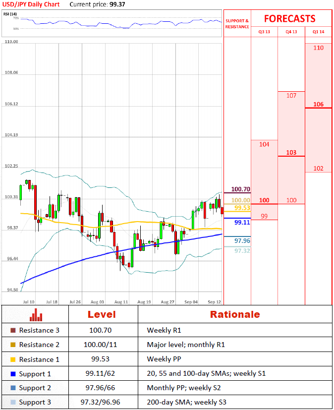 Перспективы парыКраткосрочные индикаторы RSI и Стохастический, а также горсть скользящих средних за 20, 55 и 100 дней говорят нам о скором появлении неспокойных сессий (в зоне от 99 по 101 JPY) в ближайшем будущем. 100.7 — это промежуточная цель для пары, если она желает продвинуться выше. Понижение за черту 98 JPY может разжечь распродажу до 96 JPY. В долгосрочной перспективе мы можем ожидать от пары наращивания оборотов и начала стремления до 103 JPY, где находится среднее значение ожиданий основных участников рыка.