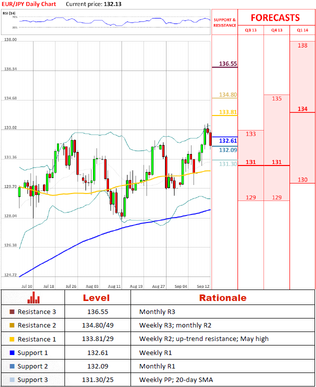 Перспективы парыСопротивление на 133.81/29 не разрешило EUR/JPY вырасти вчера еще больше, заставив пару вернуться с месячной R1. Тем не менее, коррекция должна быть остановлена одной из ближайших поддержек в ближайшем будущем, если верить техническим индикаторам, которые в большинстве своем дают сигналы на покупку на различных временных графиках. Падение, скорее всего, будет остановлено комбинацией 100-дневной средней скользящей и месячной точки разворота на 130.69/03.
