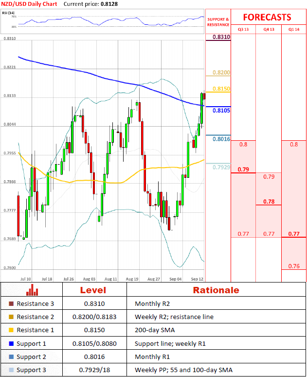 Перспективы парыNZD/USD вчера закрылась выше 0.8105, но сейчас кажется, что она испытывает трудности на 200-дневной средней скользящей (0.8150). Другая опасная зона сопротивления находится недалеко, а именно на 0.8200/0.8183. Ее целостность предполагает, что долгосрочный прогноз по валютной паре до сих пор остается в силе; соответственно, мы склонны верить в то, что цена должна скоро начать нацеливаться на месячную R1 на 0.8016 и 100-дневную среднюю скользящую на 0.7923.