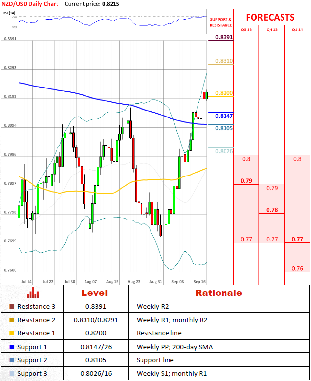 Перспективы парыПервоначально мы предполагали, что будет иметься значительное давление продаж между уровнями 0.82 и 0.81, чтобы не дать паре возможность торговаться выше после падения на 0.7682. Тем не менее, NZD/USD уверенно идет вверх, как предполагается по дневным и месячным индикаторам, без длительных остановок на какой-либо из сопротивлений, сложными они будут или нет. Сейчас пара торгуется около 0.82, и это означает, что имеется высокая вероятность того, что негативный прогноз скоро будет не действителен.