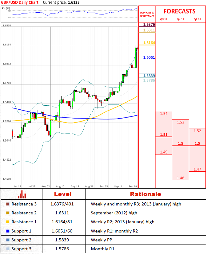 Перспективы парыНесмотря на замедление темпов в последние дни, пара подскочила почти на 250 пунктов, прорвав сопротивление восходящего тренда и в настоящий момент проверяет на прочность максимум 2013 года (январь). Может случится, что мы получим незначительный регресс, когда быки будут капитализировать свою прибыль, но 1.616 будет скоро преодолена, нанеся на карту следующую отметку на 1.63. Провал на 1.616 может спровоцировать распродажу до прежних, перед прыжком, уровней на 1.58.