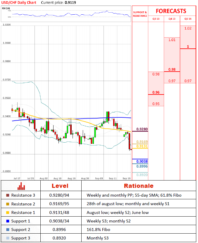 Перспективы пары Пара свалилась на больше чем 150 пунктов после столкновения с недельной и месячной точками РР/линией Фибоначчи 61.8% несколько дней назад. В настоящий момент она торгуется на самых низких уровнях, начиная с февраля 2013 года. Подъём над упомянутыми июньским и августовским минимумами снял бы большую долю риска и вернул бы обратно на карту недельную и месячную точки РР/линию Фибоначчи 61.8%. Область 0.917/19 не должна составить трудностей на пути к этой цели. Неспособность провести это, тем не менее, может отправить пару прямо к отметке 90 центов.