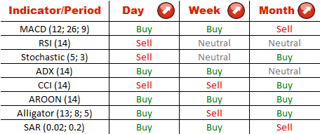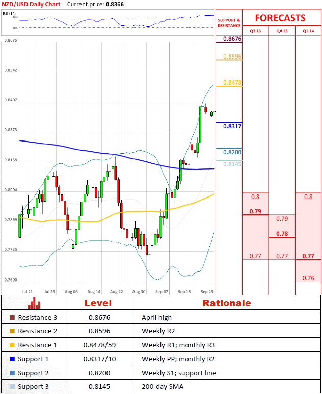 Having lost its bullish momentum, NZD/USD is slowly grinding lower after peaking at 0.8435 on Sep 19, though technicals on all three relevant time-frames are pointing north at the moment. The support where the price could attempt to resume the up-move is at 0.8317/10, it consists of the weekly pivot point and the monthly R2 level, but then the currency pair will have to face a tough resistance area at 0.8478/59.