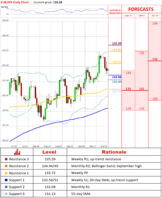 Just as suspected, once EUR/JPY touched upon the positively-sloping trend-line at 132.56/51, the currency pair immediately went upwards. Accordingly, we would expect the price to target the weekly pivot point at 133.72 next. Moreover, the rally should not end there, but reach the upper boundary of the bullish channel the rate has been forming since the beginning of August.