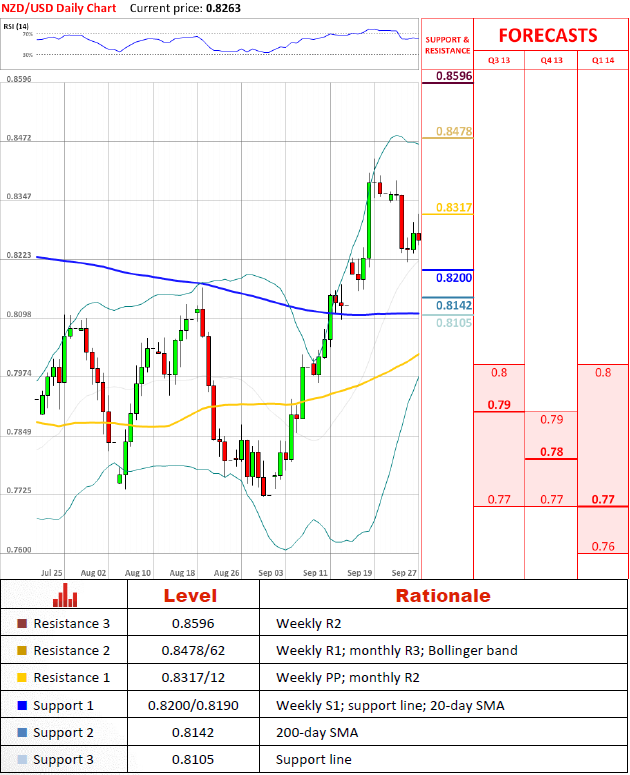 - ANZ Bank New Zealand Ltd. (по материалам Bloomberg)Перспективы парыДля NZD/USD, чтобы подтвердить желание возобновить восстановление, ей надо подняться выше 0.8317/12 сперва, потом пройти 0.8479/62, сопротивление, перед которым валютная пара сделала разворот на прошлой неделе. Недельня точка разворота и месячная R2, однако, не хотят сдаваться без борьбы и давать возможость продолжаться восхождению, начатому на 0.82.