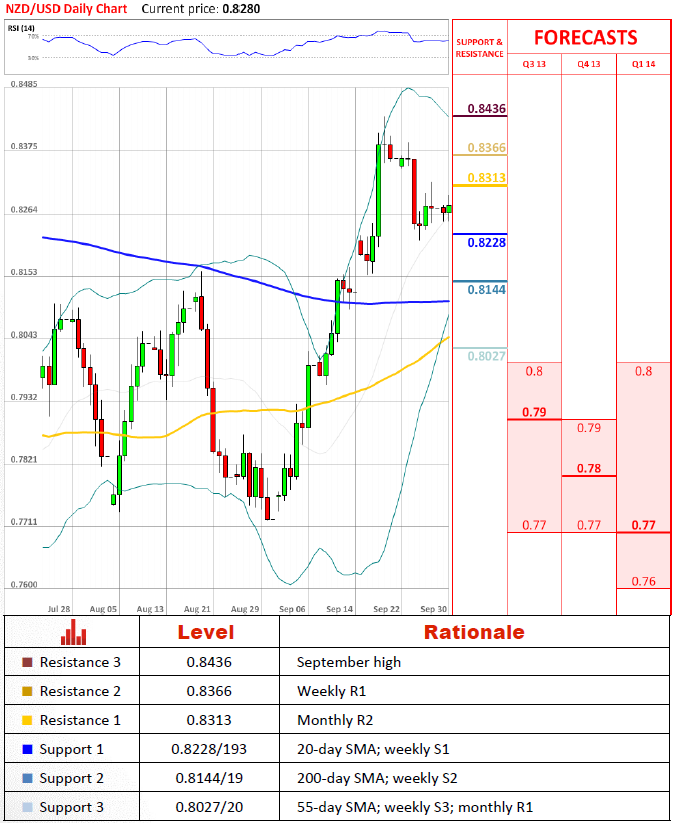 - ANZ Bank New Zealand Ltd. (по материалам Bloomberg)Перспективы парыЗа прошедшую неделю пара сдерживалась месячной R2 и 20-дневной средней скользящей. Начало недели сохранило пару в то же диапазоне. Краткосрочные технические индикаторы предполагают, что пара имеет желание продемонстрировать серьезное восхождение, и мы думаем, что только 20-дневная средняя скользящая может предоставить импульс для этого. В этом случае, пара должна вырасти выше 0.837 для того, чтобы убрать вероятность появления другого падения.